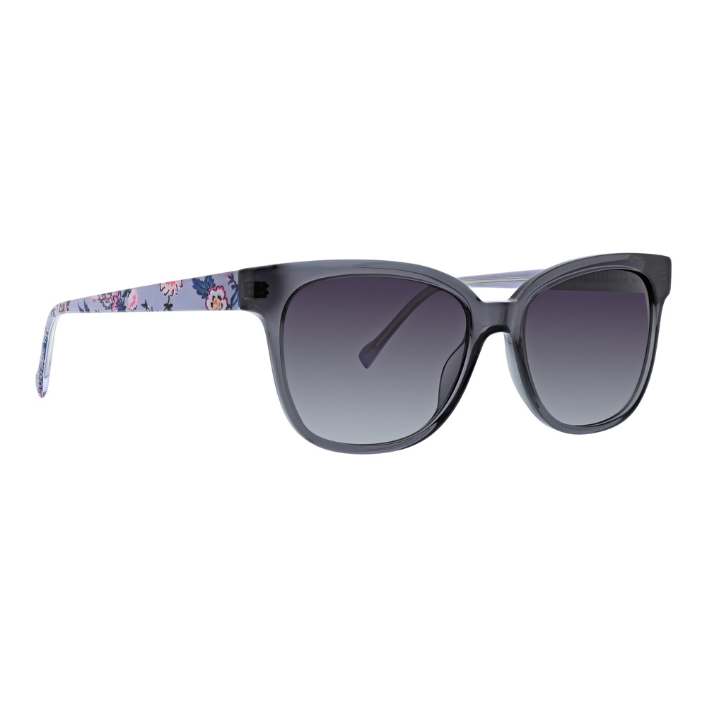 First, let’s meet our sun frames. Parris is an oversized butterfly shape frame with unique Austrian crystal decor. Super lightweight and featuring a spring hinge for comfort, Parris is available in two colorways featuring signature Vera Bradley patterns Soft Sky Paisley & Paradise Coral. Each colorway represents a distinctive signature pattern from Vera Bradley, offering a variety of choices for the fashion-forward woman.